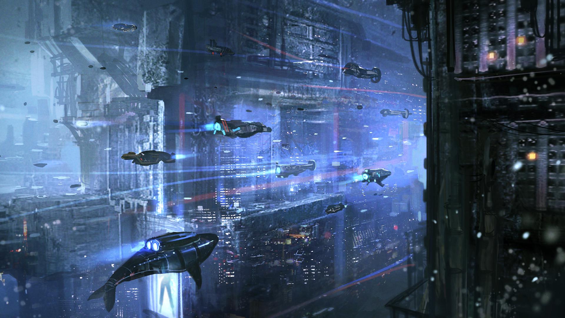 Cyberpunk City With Flying Ships